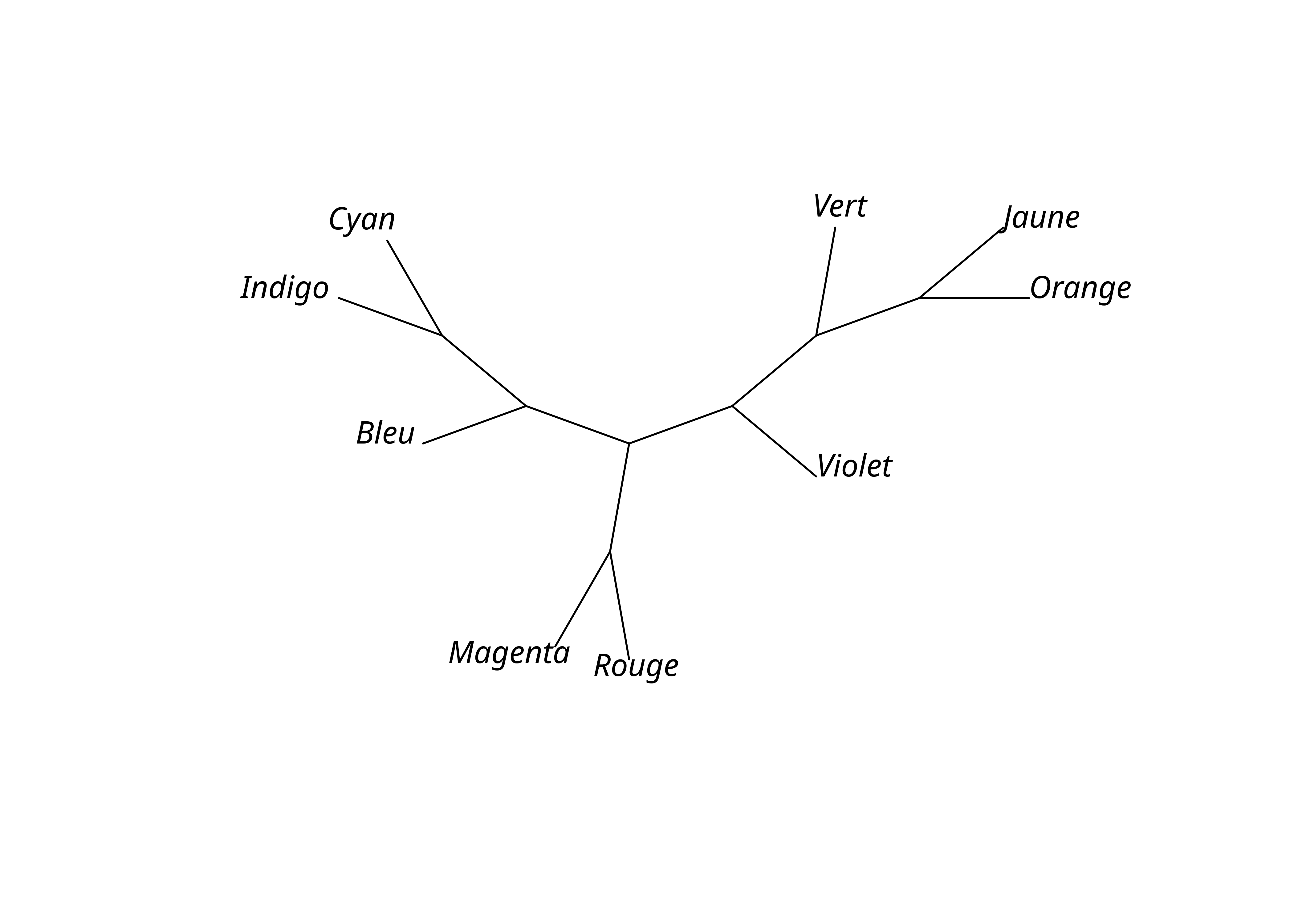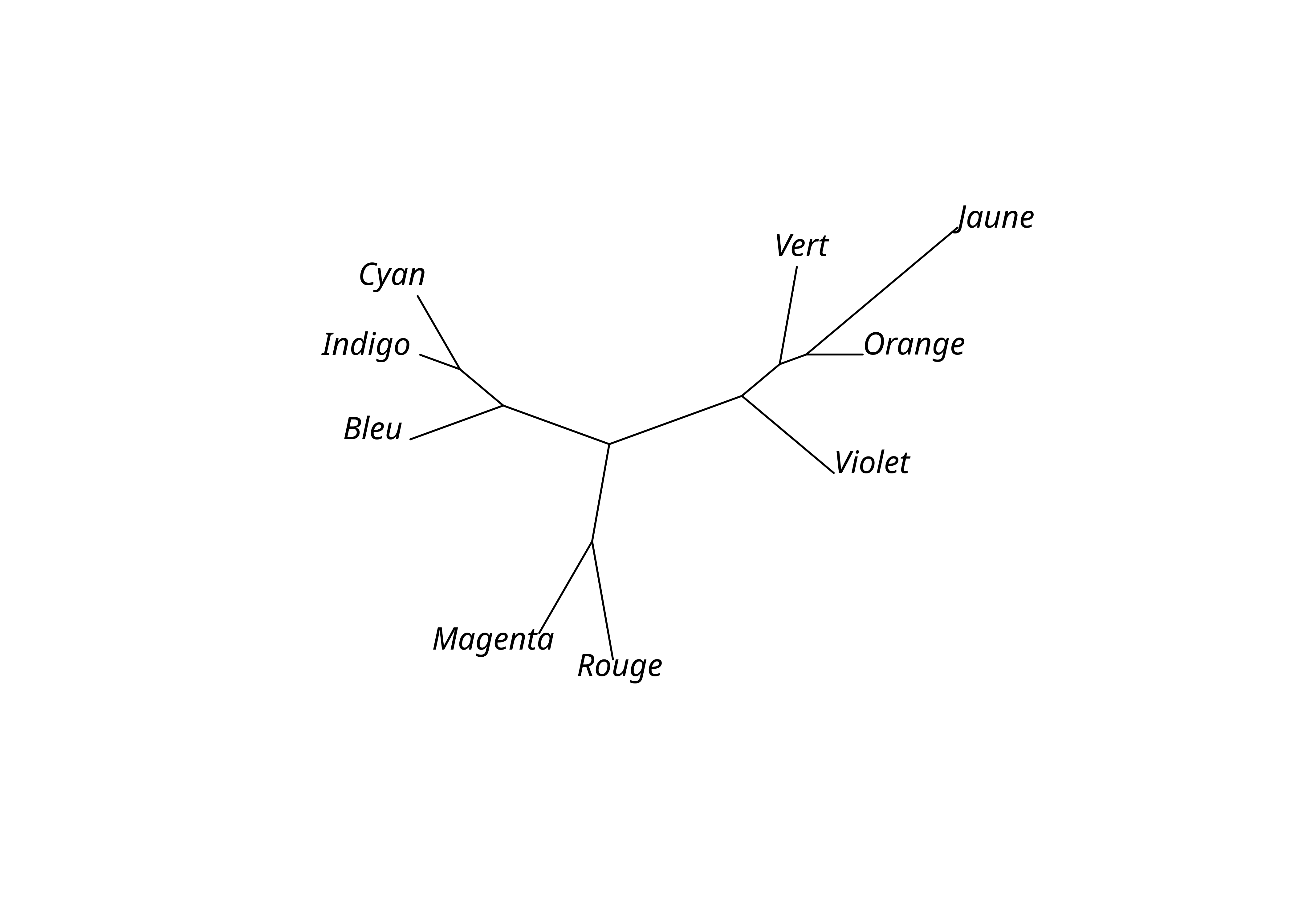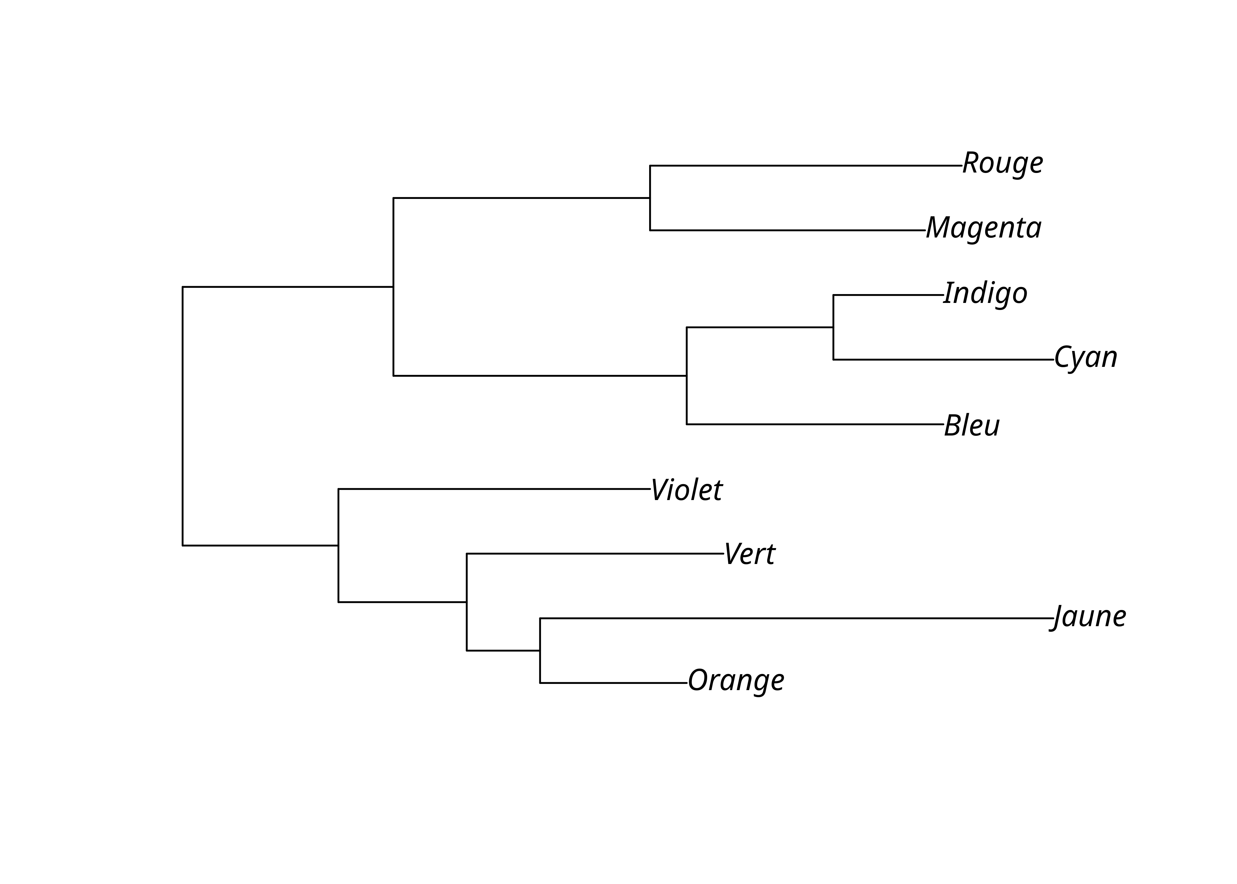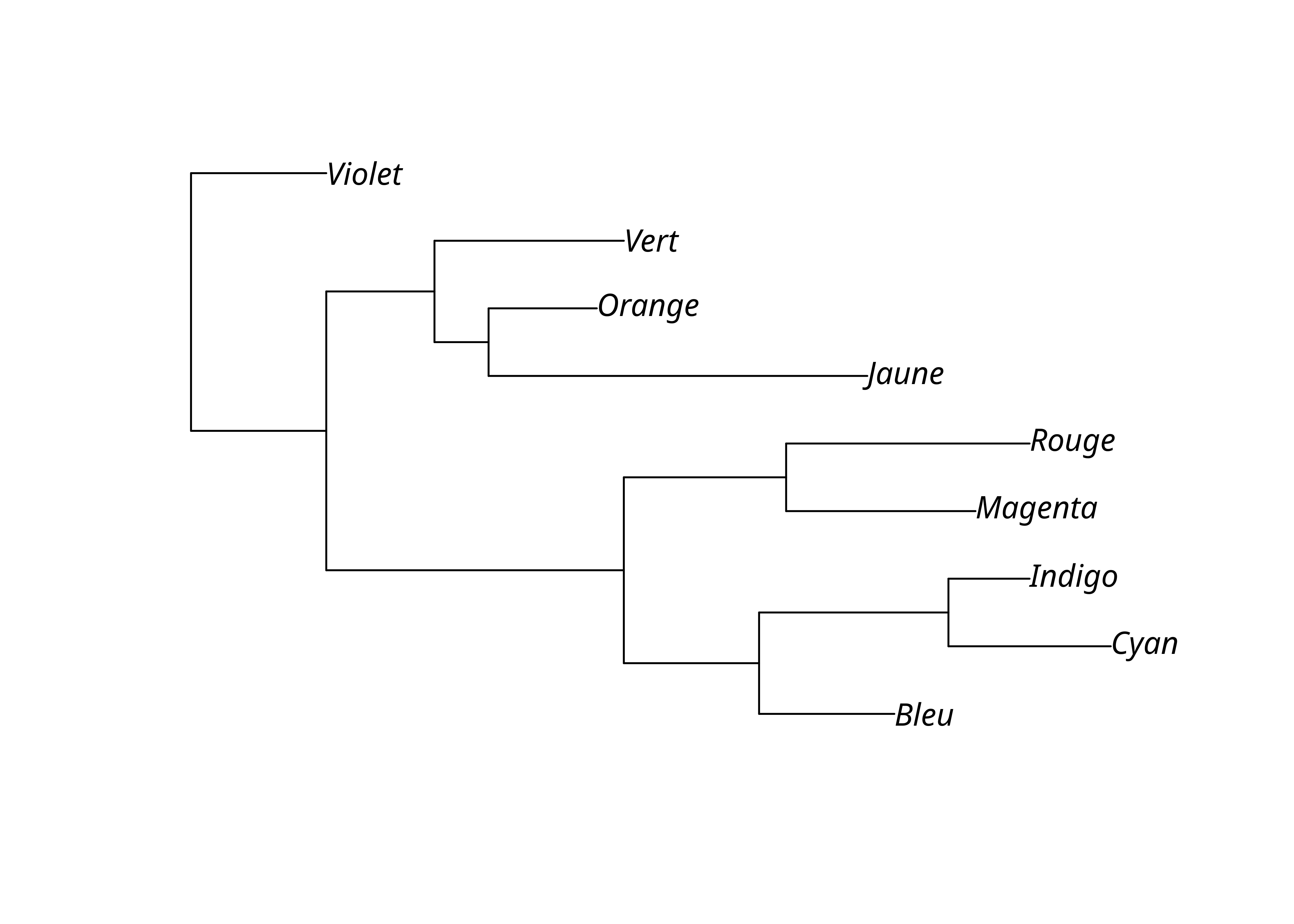 Une autre méthode nécessite de déterminer un extra-groupe ou groupe externe (outgroup). La fonction root() permet de procéder à l’enracinement en indiquant le numéro ou le nom du taxon constituant le groupe externe, par exemple «Violet». Cela présuppose bien sûr qu’il ait été inclus dans l’analyse de départ.